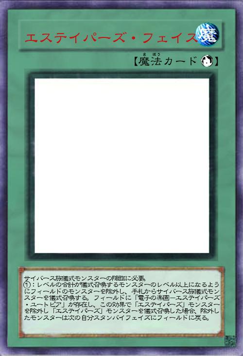 | サイバース族儀式モンスターの降臨に必要。 ①:レベルの合計が儀式召喚するモンスターのレベル以上になるようにフィールドのモンスターを除外し、手札からサイバース族儀式モンスターを儀式召喚する。フィールドに「電子の楽園-エステイパーズ・ユートピア」が存在し、この効果で「エステイパーズ」モンスターを除外し「エステイパーズ」モンスターを儀式召喚した場合、除外したモンスターは次の自分スタンバイフェイズにフィールドに戻る。 | |||