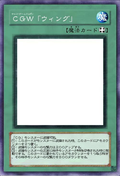 | 「CG」モンスターに装備可能。 ①:このカードがモンスターに装備された時、このカードにアモカウンターを2つ置く。 ②:装備モンスターの攻撃力は200アップする。 ③:装備モンスターの正面に相手モンスターが特殊召喚された時に発動できる。このカードに置かれているアモカウンターを1つ取り除き、その相手モンスターの攻撃力を500ダウンさせる。 | |||