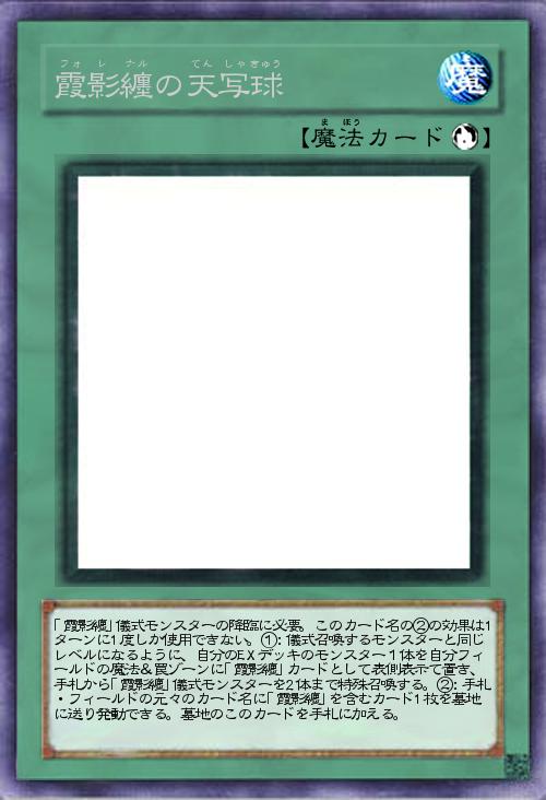 リリースの代わりにEXデッキのモンスターを霞影纏カード扱いの永続魔法として魔法罠ゾーンに置き、霞影纏儀式を2体まで儀式召喚という珍妙な効果。レベルの合計と同じとは書いていないので万華鏡などとは違い同じレベルの儀式モンスターしか出せないということですね。