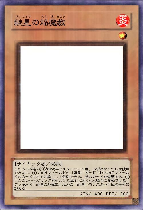 | このカード名の①②の効果は1ターンに1度、いずれか1つしか使用できない。①:自分フィールドの「継星」カード1枚と相手フィールドのカード1枚を対象として発動できる。そのカードを破壊する。②:このカードがリンク素材として墓地へ送られた場合に発動できる。デッキから「継星の焔魔教」以外の「継星」モンスター1体を手札に加える。 | |||