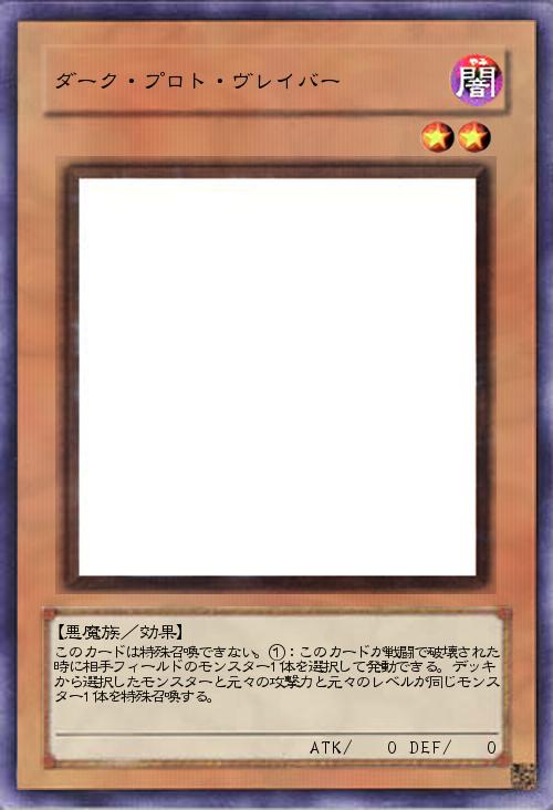 | このカードは特殊召喚できない。①:このカードが戦闘で破壊された時に相手フィールドのモンスター1体を選択して発動できる。デッキから選択したモンスターと元々の攻撃力と元々のレベルが同じモンスター1体を特殊召喚する。 | |||