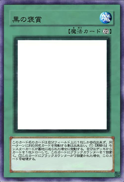 | このカード名のカードは自分フィールド上に1枚しか存在出来ず、同一ターンに別の同名カードを発動する事は出来ない。①『黒騎士』モンスターカードが墓地に送られた場合に発動する。自分はデッキからカードを1枚ドローして、このカードにブラックカウンターを1個置く。②このカードにブラックカウンターが3個置かれた場合、このカードを破壊する。 | |||