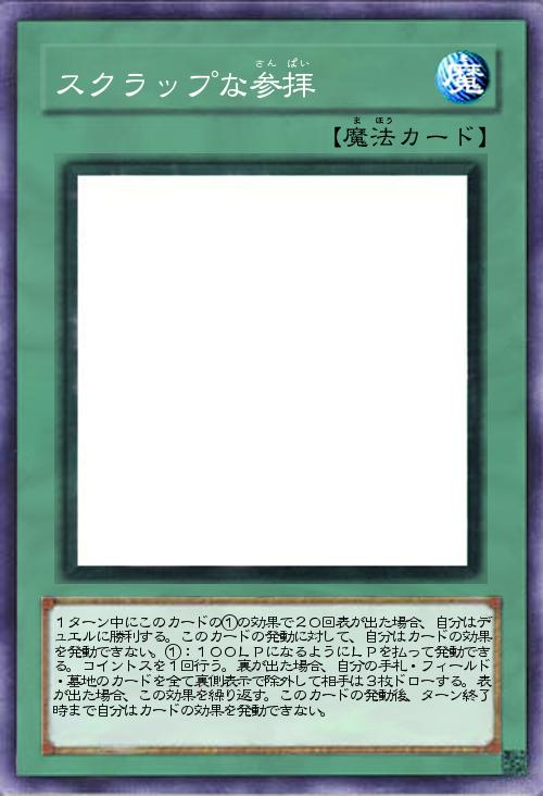 | 1ターン中にこのカードの①の効果で20回表が出た場合、自分はデュエルに勝利する。このカードの発動に対して、自分はカードの効果を発動できない。①:100LPになるようにLPを払って発動できる。コイントスを1回行う。裏が出た場合、自分の手札・フィールド・墓地のカードを全て裏側表示で除外して相手は3枚ドローする。表が出た場合、この効果を繰り返す。このカードの発動後、ターン終了時まで自分はカードの効果を発動できない。 | |||