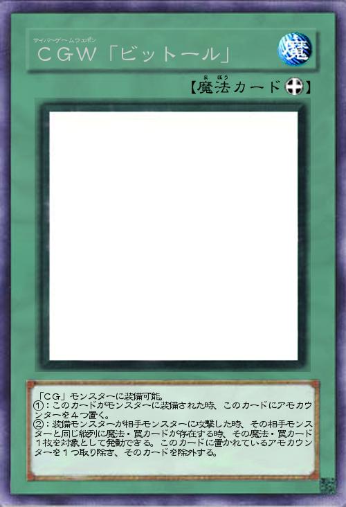 | 「CG」モンスターに装備可能。 ①:このカードがモンスターに装備された時、このカードにアモカウンターを4つ置く。 ②:装備モンスターが相手モンスターに攻撃した時、その相手モンスターと同じ縦列に魔法・罠カードが存在する時、その魔法・罠カード1枚を対象として発動できる。このカードに置かれているアモカウンターを1つ取り除き、そのカードを除外する。 | |||