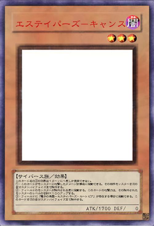 | このカード名の③の効果は1ターンに1度しか使用できない。 ①:このカードがモンスターに攻撃したダメージ計算後に発動できる。その相手モンスターを次の自分スタンバイフェイズまで除外する。 ②:フィールドのモンスターが除外される度に発動する。このカードの攻撃力は、その除外されたモンスターのレベルの合計×100アップする。 ③:フィールドに「電子の楽園-エステイパーズ・ユートピア」が存在する場合に発動できる。このカードを次の自分スタンバイフェイズまで除外する。 | |||