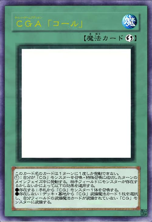 | このカード名のカードは1ターンに1度しか発動できない。 ①:自分が「CG」モンスターを召喚・特殊召喚に成功したターンのメインフェイズ中に発動する。相手フィールドにモンスターが存在するかしないかによって以下の効果を適用する。 ●存在する:手札から「CG」モンスター1体を召喚する。 ●存在しない:デッキ・墓地から「CG」装備魔法カード1枚を選択し、自分フィールドの装備魔法カードが装備されていない「CG」モンスターに装備する。 | |||