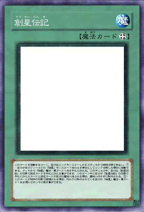 | このカードを発動するターン、自分はリンクモンスターしかEXデッキから特殊召喚できない。①:自分が自分フィールドの「継星」モンスター1体のみを素材としてリンク召喚した場合に発動できる。デッキから「継星」魔法・罠カード1枚を手札に加える。このデュエル中、自分は「創星伝記」の効果で同名カードを手札に加える事ができず、このターン中に自分が「創星伝記」の効果で手札に加えたカードと同名カードが自分の墓地へ送られる場合、墓地へ行かずに除外される。②:このカードが相手の効果で破壊される場合、代わりに除外されている自分の「継星」魔法・罠カード1枚を選んでデッキに戻す事ができる。 | |||