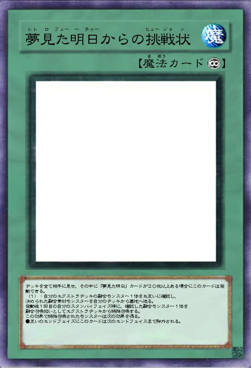 | デッキを全て相手に見せ、その中に「夢見た明日」カードが20枚以上ある場合にこのカードは発動できる。 (1):自分のエクストラデッキの融合モンスター1体をお互いに確認し、 決められた融合素材モンスターを自分のデッキから墓地へ送る。 発動後1回目の自分のスタンバイフェイズ時に、確認した融合モンスター1体を 融合召喚扱いとしてエクストラデッキから特殊召喚する。 この効果で特殊召喚されたモンスターは次の効果を得る。 ●互いのエンドフェイズにこのカードは次のエンドフェイスまで除外される。 | |||