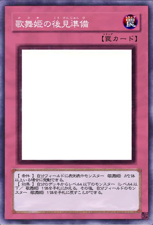 | 【 条件 】自分フィールドに表側表示モンスター(歌舞姫)が2体以上いる場合に発動できる。 【 効果 】自分のデッキからレベル4以下のモンスター(レベル4以下/ 歌舞姫)1体を手札に加える。その後、自分フィールドのモンスター(歌舞姫)1体を手札に戻すことができる。 | |||