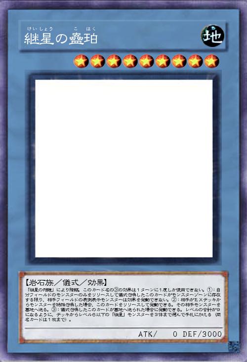 | 「継星の残鎧」により降臨。このカード名の③の効果は1ターンに1度しか使用できない。①:自分フィールドのモンスターのみをリリースして儀式召喚したこのカードがモンスターゾーンに存在する限り、相手フィールドの表側表示モンスターは効果を発動できない。②:相手がEXデッキからモンスターを特殊召喚した場合、このカードをリリースして発動できる。その相手モンスターを墓地へ送る。③:儀式召喚したこのカードが墓地へ送られた場合に発動できる。レベルの合計が9になるように、デッキからレベル6以下の「継星」モンスターを3体まで選んで手札に加える(同名カードは1枚まで)。 | |||