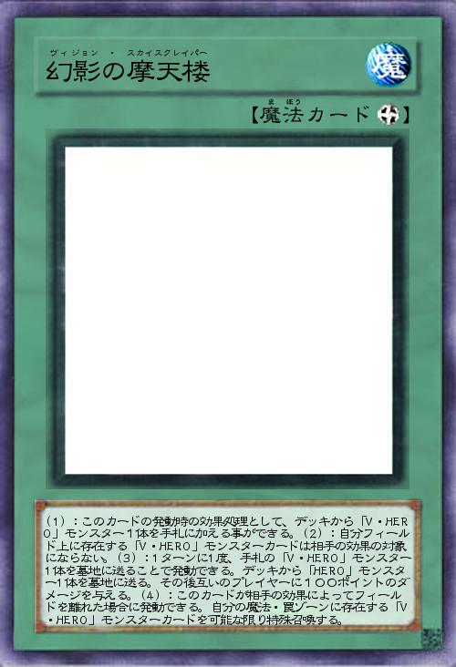 | (1):このカードの発動時の効果処理として、デッキから「V・HERO」モンスター1体を手札に加える事ができる。(2):自分フィールド上に存在する「V・HERO」モンスターカードは相手の効果の対象にならない。(3):1ターンに1度、手札の「V・HERO」モンスター1体を墓地に送ることで発動できる。デッキから「HERO」モンスター1体を墓地に送る。その後互いのプレイヤーに100ポイントのダメージを与える。(4):このカードが相手の効果によってフィールドを離れた場合に発動できる。自分の魔法・罠ゾーンに存在する「V・HERO」モンスターカードを可能な限り特殊召喚する。 | |||