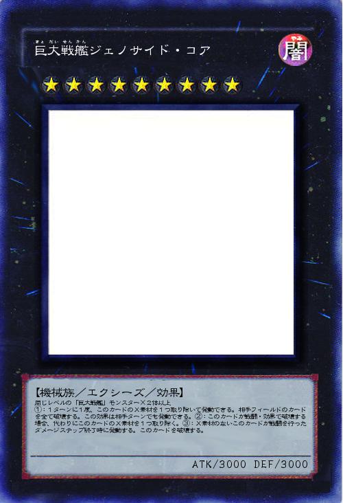 | 同じレベルの「巨大戦艦」モンスター×2体以上 ①:1ターンに1度、このカードのX素材を1つ取り除いて発動できる。相手フィールドのカードを全て破壊する。この効果は相手ターンでも発動できる。②:このカードが戦闘・効果で破壊する場合、代わりにこのカードのX素材を1つ取り除く。③:X素材のないこのカードが戦闘を行ったダメージステップ終了時に発動する。このカードを破壊する。 | |||