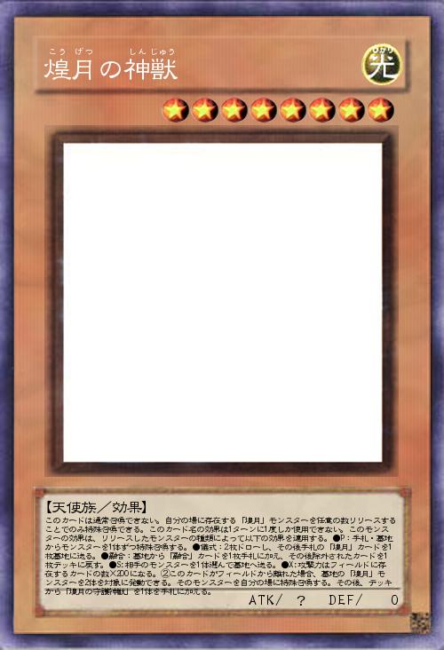 | このカードは通常召喚できない。自分の場に存在する「煌月」モンスターを任意の数リリースすることでのみ特殊召喚できる。このカード名の効果は1ターンに1度しか使用できない。このモンスターの効果は、リリースしたモンスターの種類によって以下の効果を適用する。●P:手札・墓地からモンスターを1体ずつ特殊召喚する。●儀式:2枚ドローし、その後手札の「煌月」カードを1枚墓地に送る。●融合:墓地から「融合」カードを1枚手札に加え、その後除外されたカードを1枚デッキに戻す。●S:相手のモンスターを1体選んで墓地へ送る。●X:攻撃力はフィールドに存在するカードの数×200になる。②このカードがフィールドから離れた場合、墓地の「煌月」モンスターを2体を対象に発動できる。そのモンスターを自分の場に特殊召喚する。その後、デッキから「煌月の守護神獣」を1体を手札に加える。 | |||
