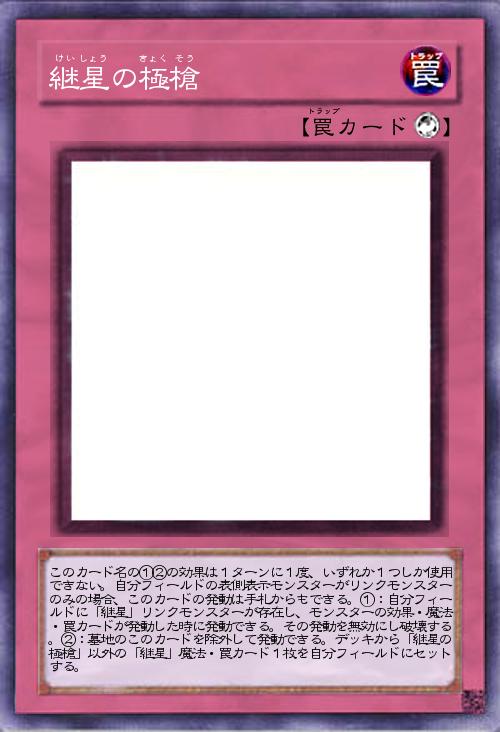 | このカード名の①②の効果は1ターンに1度、いずれか1つしか使用できない。自分フィールドの表側表示モンスターがリンクモンスターのみの場合、このカードの発動は手札からもできる。①:自分フィールドに「継星」リンクモンスターが存在し、モンスターの効果・魔法・罠カードが発動した時に発動できる。その発動を無効にし破壊する。②:墓地のこのカードを除外して発動できる。デッキから「継星の極槍」以外の「継星」魔法・罠カード1枚を自分フィールドにセットする。 | |||
