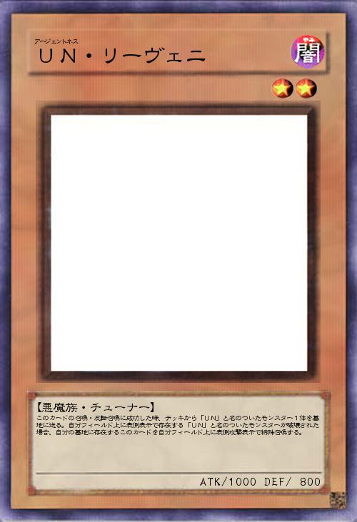 | このカードの召喚・反転召喚に成功した時、デッキから「UN」と名のついたモンスター1体を墓地に送る。自分フィールド上に表側表示で存在する「UN」と名のついたモンスターが破壊された場合、自分の墓地に存在するこのカードを自分フィールド上に表側攻撃表示で特殊召喚する。 | |||