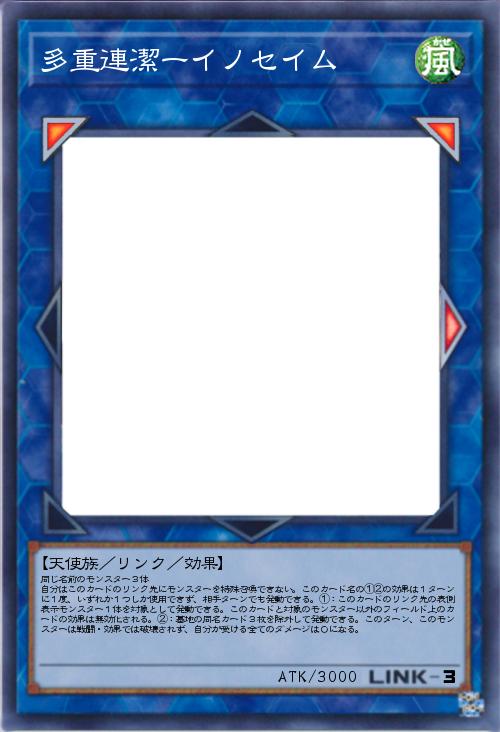 | 同じ名前のモンスター3体 自分はこのカードのリンク先にモンスターを特殊召喚できない。このカード名の①②の効果は1ターンに1度、いずれか1つしか使用できず、相手ターンでも発動できる。①:このカードのリンク先の表側表示モンスター1体を対象として発動できる。このカードと対象のモンスター以外のフィールド上のカードの効果は無効化される。②:墓地の同名カード3枚を除外して発動できる。このターン、このモンスターは戦闘・効果では破壊されず、自分が受ける全てのダメージは0になる。 | |||