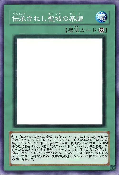 | ①:「伝承されし聖域の楽譜」は自分フィールドに1枚しか表側表示で存在できない。②:自分フィールドにカード名が異なる「聖域の歌姫」モンスターが3体以上存在する場合、表側表示のこのカードは相手の効果を受けない。③:自分フィールドにカード名が異なるモンスターが2体以上存在する場合、1ターンに1度、手札から「歌姫の」魔法・罠カードを捨てて発動できる。自分フィールドの全てのモンスターとはカード名が異なる「聖域の歌姫」モンスター1体をデッキから特殊召喚する。 | |||