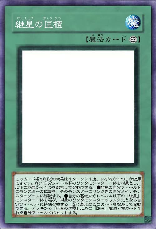 | このカード名の①②の効果は1ターンに1度、いずれか1つしか使用できない。①:自分フィールドのリンクモンスター1体を対象とし、以下の効果から1つを選択して発動できる。●対象の自分フィールドのモンスターの位置を、そのモンスターのリンク先の自分メインモンスターゾーンに移動する。●自分の墓地からレベル4以下の「継星」モンスター1体を選び、対象のリンクモンスターのリンク先となる自分フィールドに特殊召喚する。②:墓地のこのカードを除外して発動できる。デッキから「継星の匡櫃」以外の「継星」魔法・罠カード1枚を自分フィールドにセットする。 | |||