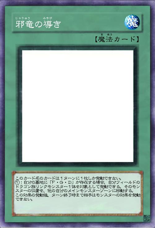 | このカード名のカードは1ターンに1枚しか発動できない。 ①:自分の墓地に「F・G・D」が存在する場合、自分フィールドのドラゴン族リンクモンスター1体を対象として発動できる。そのモンスターの位置を、他の自分のメインモンスターゾーンに移動する。 この効果の発動後、ターン終了時まで相手はモンスターの効果を発動できない。 | |||