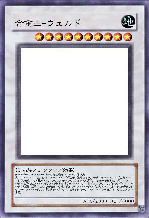 | チューナー+チューナー以外の岩石族モンスター2体以上 ①:1ターンに1度、自分バトルフェイズ開始時に発動できる。相手フィールド上に「合金トークン」(岩石族・地・星3・攻1000/守3000)を表側攻撃表示で特殊召喚する。②:このカードの攻撃力はフィールド上に存在する「合金トークン」の数×2000アップする。③:このカードが戦闘・効果によって破壊される時、代わりにフィールドの「合金トークン」1体を破壊できる。④:フィールド上の「合金トークン」が破壊された時、このカードの守備力は1000ダウンする。 | |||