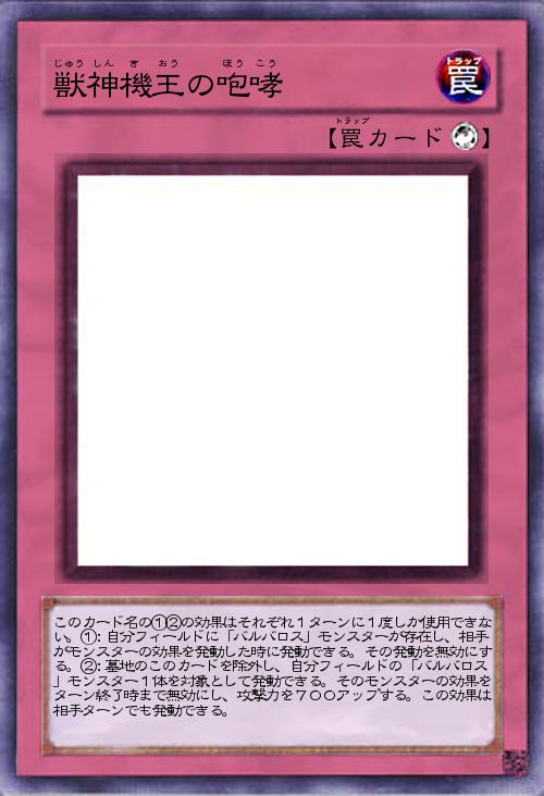 | このカード名の①②の効果はそれぞれ1ターンに1度しか使用できない。①:自分フィールドに「バルバロス」モンスターが存在し、相手がモンスターの効果を発動した時に発動できる。その発動を無効にする。②:墓地のこのカードを除外し、自分フィールドの「バルバロス」モンスター1体を対象として発動できる。そのモンスターの効果をターン終了時まで無効にし、攻撃力を700アップする。この効果は相手ターンでも発動できる。 | |||
