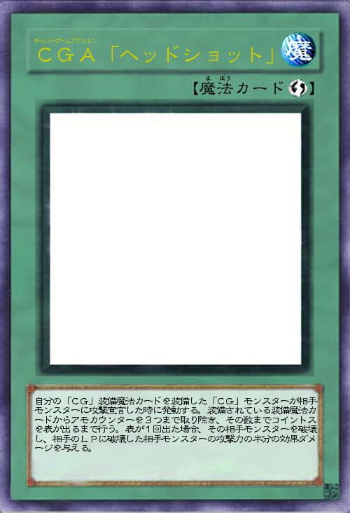 | 自分の「CG」装備魔法カードを装備した「CG」モンスターが相手モンスターに攻撃宣言した時に発動する。装備されている装備魔法カードからアモカウンターを3つまで取り除き、その数までコイントスを表が出るまで行う。表が1回出た場合、その相手モンスターを破壊し、相手のLPに破壊した相手モンスターの攻撃力の半分の効果ダメージを与える。 | |||