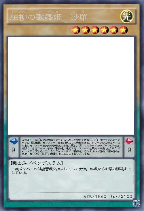 | このカードの①のP効果は1ターンに1度しか使用できない。①:自分モンスターゾーンの「歌舞姫」モンスター1体を対象にして発動できる。Pゾーンのこのカードと対象のモンスターを元々の持ち主の手札に戻す。②:このカードがPゾーンに存在する限り、自分フィールドの「歌舞姫」通常Pモンスターの攻撃力・守備力は500ポイントアップする。③:自分フィールドに「歌舞姫」モンスターが召喚・特殊召喚する度、自分を500LP回復しデッキから1枚ドローする。 | |||