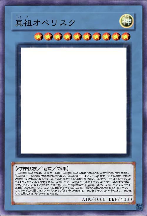 | 『王の証』により降臨。このカードは『王の証』による儀式召喚以外の方法で特殊召喚できない。①このカードの特殊召喚は無効にされない。②このカードはリリースされず、元々の属性・種族が神属性・幻神獣族となるモンスター以外のカードの効果を受けない。③自分フィールドのモンスター2体をリリースして発動できる。このターン、このカードは相手モンスター全てに1度ずつ攻撃でき、バトルフェイズの間だけ相手モンスターの効果は無効になる。また、このターンこのカードは戦闘では破壊されず、互いへの戦闘ダメージは0になる。④③の効果が適用されているターン、このカードが攻撃したダメージステップ終了時に発動する。その相手モンスターを破壊し、その元々の攻撃力分だけダメージを与える。 | |||