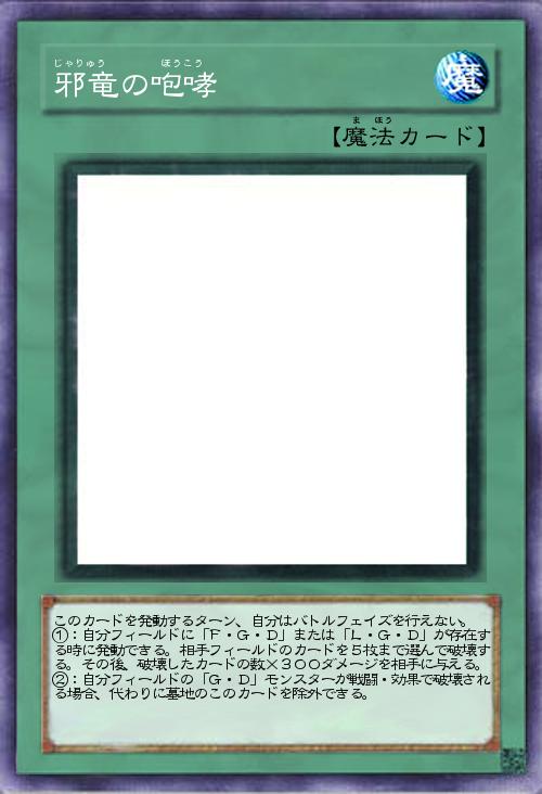 | このカードを発動するターン、自分はバトルフェイズを行えない。 ①:自分フィールドに「F・G・D」または「L・G・D」が存在する時に発動できる。相手フィールドのカードを5枚まで選んで破壊する。その後、破壊したカードの数×300ダメージを相手に与える。 ②:自分フィールドの「G・D」モンスターが戦闘・効果で破壊される場合、代わりに墓地のこのカードを除外できる。 | |||