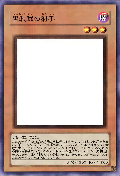 | このカード名の①②の効果はそれぞれ1ターンに1度しか使用できない。①:自分フィールドの「黒装賊」モンスター1体を対象として発動できる。そのモンスターのレベルを1つ下げ、このカードを手札から特殊召喚する。②:このカード以外の自分フィールドの「黒装賊」モンスター1体を対象として発動できる。そのモンスターのレベルをこのカードのレベルと同じにする。 | |||