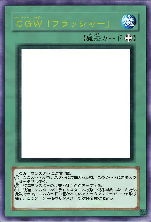 | 「CG」モンスターに装備可能。 ①:このカードがモンスターに装備された時、このカードにアモカウンターを2つ置く。 ②:装備モンスターの攻撃力は100アップする。 ③:装備モンスターが相手モンスターの攻撃・効果対象になった時に発動できる。このカードに置かれているアモカウンターを1つを取り除き、このターン中相手モンスターの効果を無効化する。 | |||