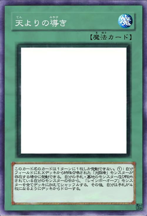| このカード名のカードは1ターンに1枚しか発動できない。①:自分フィールドにEXデッキから特殊召喚された「光臨者」モンスターが存在する場合に発動できる。自分の手札・墓地のモンスター及び除外されている自分のモンスターの中から、「レインボーオーブ」モンスターを全てデッキに加えてシャッフルする。その後、自分は手札が4枚になるようにデッキからドローする。 | |||