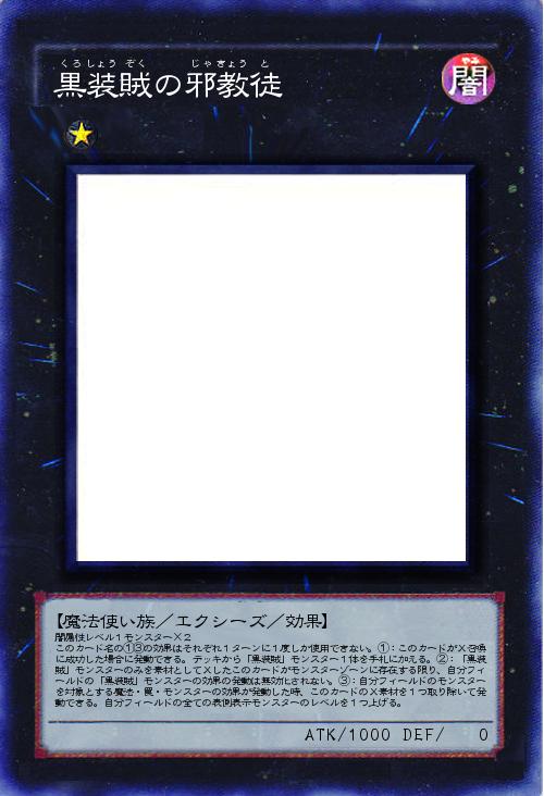 | 闇属性レベル1モンスター×2 このカード名の①③の効果はそれぞれ1ターンに1度しか使用できない。①:このカードがX召喚に成功した場合に発動できる。デッキから「黒装賊」モンスター1体を手札に加える。②:「黒装賊」モンスターのみを素材としてXしたこのカードがモンスターゾーンに存在する限り、自分フィールドの「黒装賊」モンスターの効果の発動は無効化されない。③:自分フィールドのモンスターを対象とする魔法・罠・モンスターの効果が発動した時、このカードのX素材を1つ取り除いて発動できる。自分フィールドの全ての表側表示モンスターのレベルを1つ上げる。 | |||