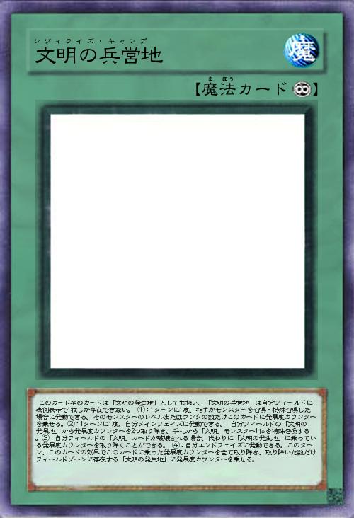 | このカード名のカードは「文明の発生地」としても扱い、「文明の兵営地」は自分フィールドに表側表示で1枚しか存在できない。 ①:1ターンに1度、相手がモンスターを召喚・特殊召喚した場合に発動できる。そのモンスターのレベルまたはランクの数だけこのカードに発展度カウンターを乗せる。②:1ターンに1度、自分メインフェイズに発動できる。 自分フィールドの「文明の発展地」から発展度カウンターを2つ取り除き、手札から「文明」モンスター1体を特殊召喚する。③:自分フィールドの「文明」カードが破壊される場合、代わりに「文明の発生地」に乗っている発展度カウンターを取り除くことができる。 ④:自分エンドフェイズに発動できる。このターン、このカードの効果でこのカードに乗った発展度カウンターを全て取り除き、取り除いた数だけフィールドゾーンに存在する「文明の発生地」に発展度カウンターを乗せる。 | |||