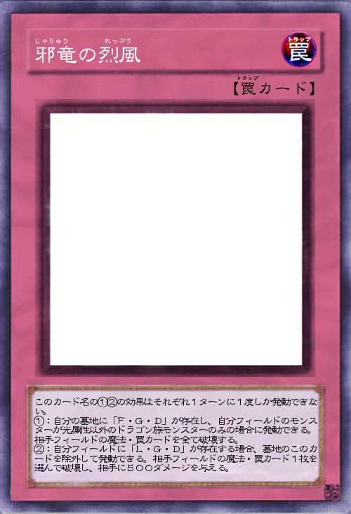 | このカード名の①②の効果はそれぞれ1ターンに1度しか発動できない。 ①:自分の墓地に「F・G・D」が存在し、自分フィールドのモンスターが光属性以外のドラゴン族モンスターのみの場合に発動できる。相手フィールドの魔法・罠カードを全て破壊する。 ②:自分フィールドに「L・G・D」が存在する場合、墓地のこのカードを除外して発動できる。相手フィールドの魔法・罠カード1枚を選んで破壊し、相手に500ダメージを与える。 | |||