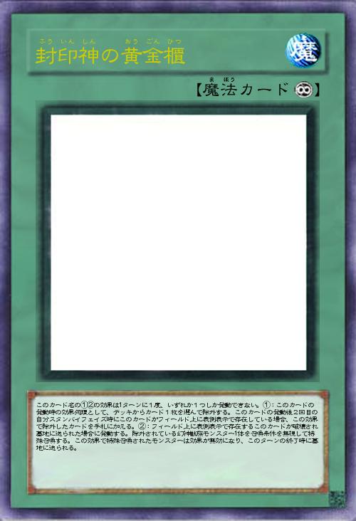 「「発動時の効果処理として〜」というテキストを持つカードということで、封印の黄金櫃のリメイクみたいなものを考えてみました。永続魔法になり、除外されている神を特殊召喚する効果を持つようになりました。タイムカプセルのほぼ上位互換となります(元カードからしてそうですが)。