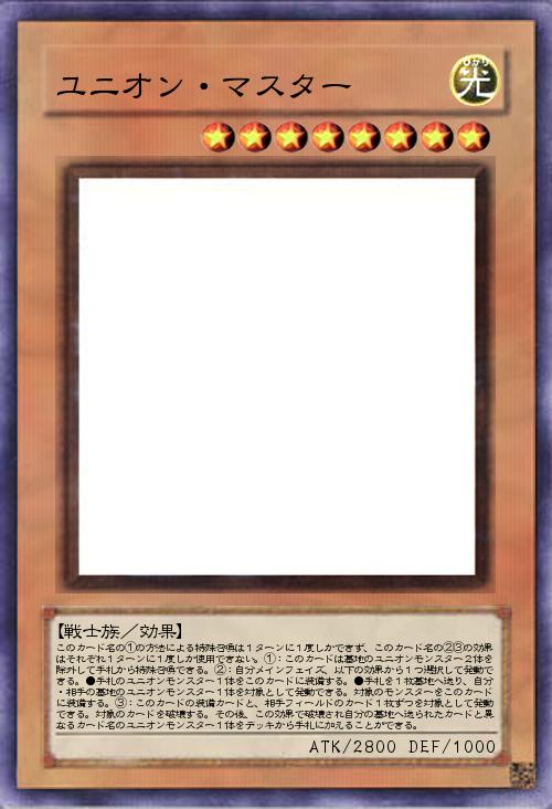 | このカード名の①の方法による特殊召喚は1ターンに1度しかできず、このカード名の②③の効果はそれぞれ1ターンに1度しか使用できない。①:このカードは墓地のユニオンモンスター2体を除外して手札から特殊召喚できる。②:自分メインフェイズ、以下の効果から1つ選択して発動できる。●手札のユニオンモンスター1体をこのカードに装備する。●手札を1枚墓地へ送り、自分・相手の墓地のユニオンモンスター1体を対象として発動できる。対象のモンスターをこのカードに装備する。③:このカードの装備カードと、相手フィールドのカード1枚ずつを対象として発動できる。対象のカードを破壊する。その後、この効果で破壊され自分の墓地へ送られたカードと異なるカード名のユニオンモンスター1体をデッキから手札に加えることができる。 | |||