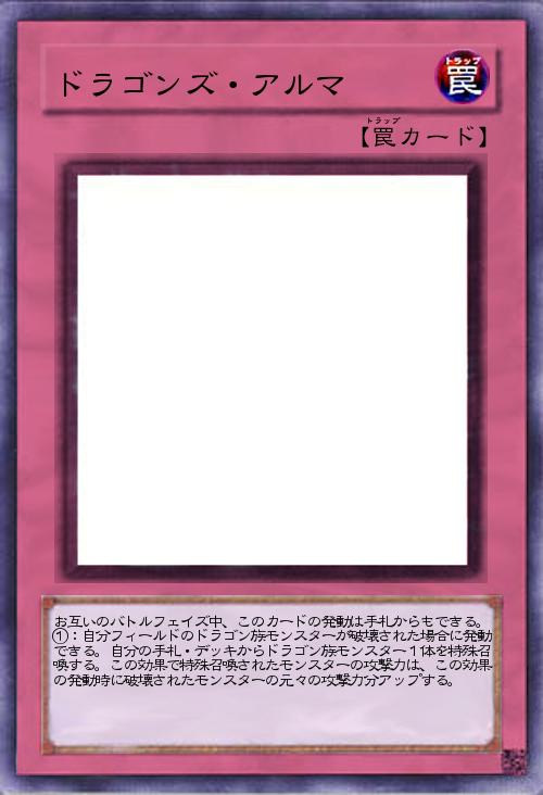 | お互いのバトルフェイズ中、このカードの発動は手札からもできる。①:自分フィールドのドラゴン族モンスターが破壊された場合に発動できる。自分の手札・デッキからドラゴン族モンスター1体を特殊召喚する。この効果で特殊召喚されたモンスターの攻撃力は、この効果の発動時に破壊されたモンスターの元々の攻撃力分アップする。 | |||