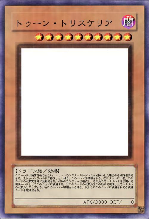 | このカードは通常召喚できない。トゥーンモンスター3体ゲームから除外した場合のみ特殊召喚できる。①トゥーンワールドが存在しない場合、このカードは破壊される。②1ターンに1度、このカードの攻撃宣言時に発動できる。相手のEXデッキを確認し、その内のモンスター1体を選んで装備カードとしてこのカードに装備する。③このカードの攻撃力はこの効果で装備したモンスターの攻撃力分アップする。④このカードが破壊される場合、代わりにこのカードに装備されてる装備カードを破壊できる。 | |||