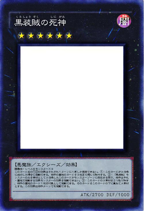 | 闇属性・レベル6モンスター×3 このカード名の①③の効果はそれぞれ1ターンに1度しか使用できない。①:このカードがX召喚に成功した場合に発動できる。相手の墓地のカードを3枚まで選んで除外する。②:「黒装賊」モンスターのみを素材としてX召喚したこのカードがモンスターゾーンに存在する限り、相手は手札・墓地で発動する効果モンスターの効果を発動できない。③:このカードのX素材を2つ取り除き、相手の墓地のカード1枚を対象として発動できる。そのカードをこのカードの下に重ねてX素材とする。この効果は相手ターンでも発動できる。 | |||