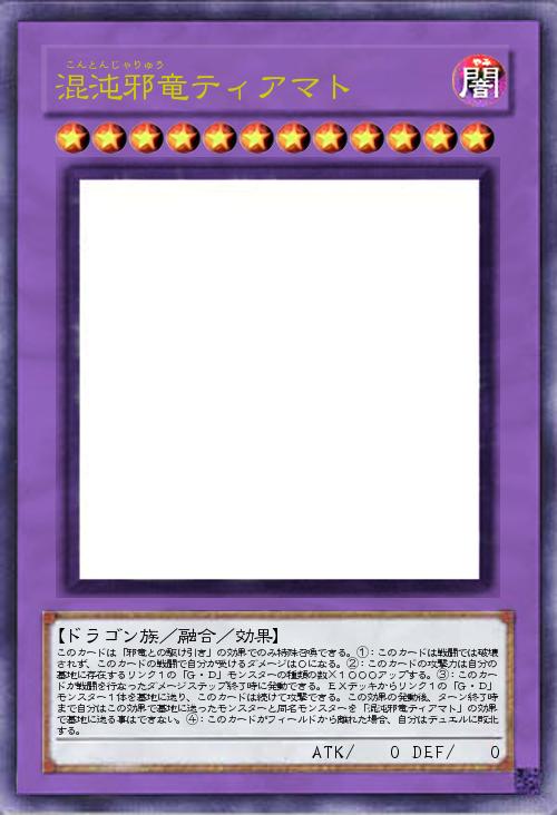 | このカードは「邪竜との駆け引き」の効果でのみ特殊召喚できる。①:このカードは戦闘では破壊されず、このカードの戦闘で自分が受けるダメージは0になる。②:このカードの攻撃力は自分の墓地に存在するリンク1の「G・D」モンスターの種類の数×1000アップする。③:このカードが戦闘を行なったダメージステップ終了時に発動できる。EXデッキからリンク1の「G・D」モンスター1体を墓地に送り、このカードは続けて攻撃できる。この効果の発動後、ターン終了時まで自分はこの効果で墓地に送ったモンスターと同名モンスターを「混沌邪竜ティアマト」の効果で墓地に送る事はできない。④:このカードがフィールドから離れた場合、自分はデュエルに敗北する。 | |||