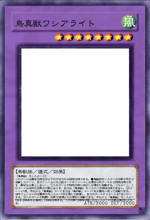 | 「鳥真獣」モンスター×2 このカードは融合召喚及び以下の方法でのみ特殊召喚できる。●鳥獣族モンスターの効果が手札で発動したターン、自分フィールドの上記カードをリリースした場合にEXデッキから特殊召喚できる(融合は必要としない)。①このカードが特殊召喚に成功した場合に発動する。このターン、このカードは相手の効果の対象にならず、自分は「鳥真獣」モンスターを特殊召喚できない。②1ターンに1度、手札から「鳥真獣」カードまたは「鳥卵獣」カード1枚を墓地へ送って発動できる。相手フィールドの攻撃表示モンスター1体を選んで破壊し、自分のデッキからカードを1枚ドローする。③このカードが戦闘・効果で破壊された場合に発動できる。手札から「鳥真獣」モンスター1体を召喚条件を無視して特殊召喚する。この効果で特殊召喚したモンスターの効果は無効化される。 | |||
