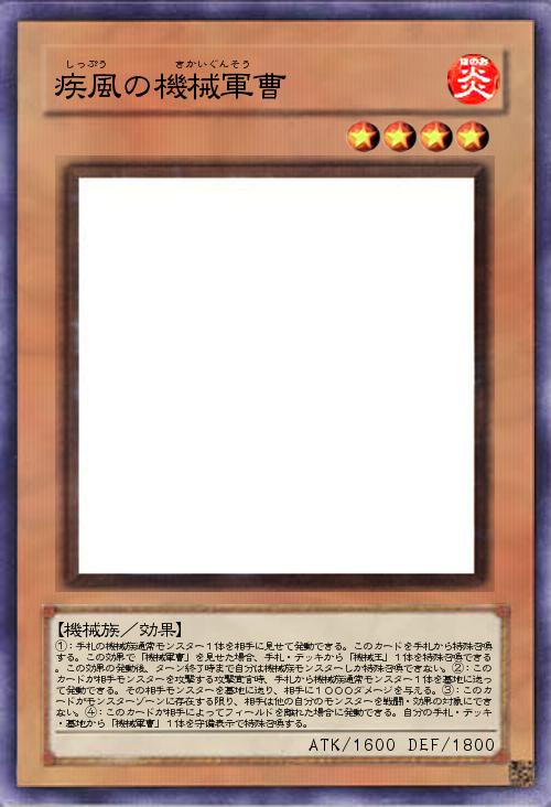 | ①:手札の機械族通常モンスター1体を相手に見せて発動できる。このカードを手札から特殊召喚する。この効果で「機械軍曹」を見せた場合、手札・デッキから「機械王」1体を特殊召喚できる。この効果の発動後、ターン終了時まで自分は機械族モンスターしか特殊召喚できない。②:このカードが相手モンスターを攻撃する攻撃宣言時、手札から機械族通常モンスター1体を墓地に送って発動できる。その相手モンスターを墓地に送り、相手に1000ダメージを与える。③:このカードがモンスターゾーンに存在する限り、相手は他の自分のモンスターを戦闘・効果の対象にできない。④:このカードが相手によってフィールドを離れた場合に発動できる。自分の手札・デッキ・墓地から「機械軍曹」1体を守備表示で特殊召喚する。 | |||