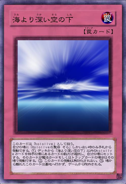 | このカードは「hololive」として扱う。 自分の場に「Hololiveの聖母 そら」しかいない時のみ手札から発動できる。①.デッキから「海より深い空の下」以外のhololiveカードを相手の場にあるカードの数だけ選択し、自分の場にセットする。そのカードが魔法カードもしくはトラップカードの場合はその場で発動できる。②.このカードの発動は無効化されない。③.場から離れたこのカードは墓地へ行かず、ゲームから除外される。 | |||