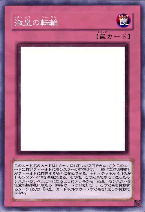 | このカード名のカードは1ターンに1度しか使用できない①:このカードは自分フィールドにモンスターが存在せず、「極点の崩壊都市」がフィールドに存在する場合に発動できる。手札・デッキから「淑皇」モンスター1体を墓地に送る。その後、この効果で墓地に送ったモンスターのレベル以下になるようにデッキから「淑皇」モンスターを任意の数手札に加える(同名カードは1枚まで)。この効果を発動するターン自分は「淑皇」カード以外のカードの効果を1度しか発動できない。 | |||