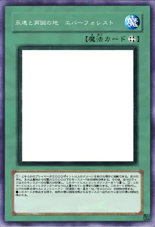 | ①:どちらかのプレイヤーが2000ポイント以上のダメージを受けた場合に発動できる。自分の手札、または墓地から攻撃力2000以下のモンスター1体を特殊召喚する。その後、自分のライフはそのモンスターの攻撃力分回復し、このカードにエレメントカウンターを1つ置く。②:このカードにエレメントカウンターが4つ以上置かれている場合に発動できる。このカードを除外し、以下の効果を持つエレメントトークン(天使族・地・星8・攻/守2000)を特殊召喚する。 ●このカードが存在する限り、相手の場に特殊召喚されるモンスターは代わりに自分の場に特殊召喚される。 | |||