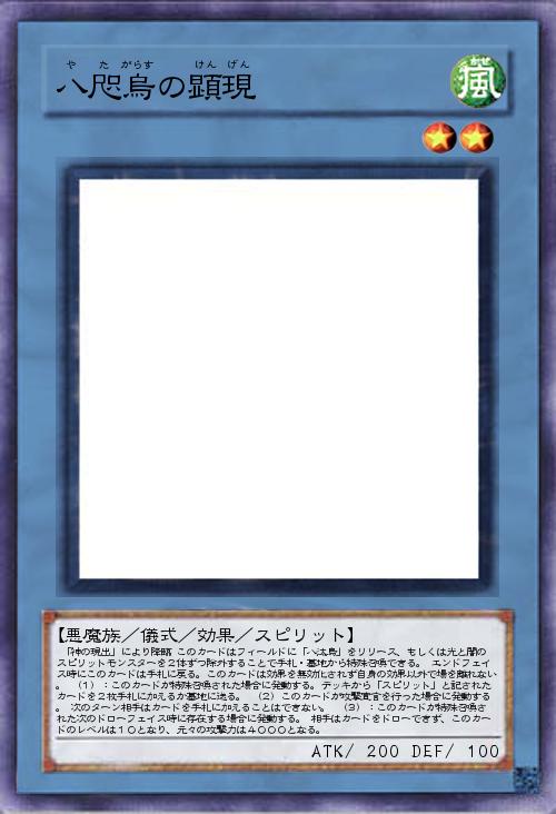 | 「神の現出」により降臨 このカードはフィールドに「八汰烏」をリリース、もしくは光と闇のスピリットモンスターを2体ずつ除外することで手札・墓地から特殊召喚できる。 エンドフェイス時にこのカードは手札に戻る。このカードは効果を無効化されず自身の効果以外で場を離れない。 (1):このカードが特殊召喚された場合に発動する。デッキから「スピリット」と記されたカードを2枚手札に加えるか墓地に送る。 (2)このカードが攻撃宣言を行った場合に発動する。 次のターン相手はカードを手札に加えることはできない。 (3):このカードが特殊召喚された次のドローフェイス時に存在する場合に発動する。 相手はカードをドローできず、このカードのレベルは10となり、元々の攻撃力は4000となる。 | |||