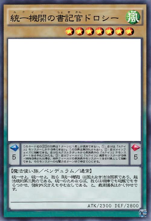 | このカード名の②③の効果は1ターンに1度しか使用できない。①:自分は「ユナイツ」モンスターしかP召喚できない。この効果は無効化されない。②:自分メインフェイズに発動できる。自分のエクストラデッキから表側表示の「ユナイツ」Pモンスター1体を手札に加える。③:自分フィールドに「ユナイツ」通常モンスターが召喚・特殊召喚された場合、相手フィールドの表側表示モンスター1体を対象として発動できる。そのモンスターの攻撃力をターン終了時まで0にする。 | |||