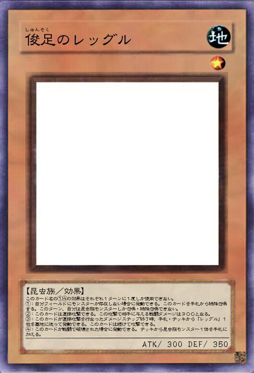 | このカード名の①④の効果はそれぞれ1ターンに1度しか使用できない。 ①:自分フィールドにモンスターが存在しない場合に発動できる。このカードを手札から特殊召喚する。このターン、自分は昆虫族モンスターしか召喚・特殊召喚できない。 ②:このカードは直接攻撃できる。この攻撃で相手に与える戦闘ダメージは300となる。 ③:このカードが直接攻撃を行なったダメージステップ終了時、手札・デッキから「レッグル」1枚を墓地に送って発動できる。このカードは続けて攻撃できる。 ④:このカードが戦闘で破壊された場合に発動できる。デッキから昆虫族モンスター1体を手札に加える。 | |||
