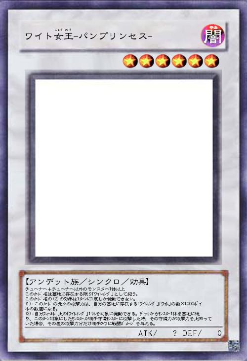 | チューナー+チューナー以外のモンスター1体以上 このカード名は墓地に存在する限り「ワイトキング」として扱う。 このカード名の(2)の効果は1ターンに1度しか発動できない。 (1):このカードの元々の攻撃力は、自分の墓地に存在する「ワイトキング」「ワイト」の数×1000ポイントの数値になる。 (2):自分フィールド上の「ワイトキング」1体を対象に発動できる。デッキからモンスター1体を墓地に送り、このターン対象にしたモンスターが相手守備モンスターに攻撃した時、その守備力が攻撃力を上回っていた場合、その差の攻撃力分だけ相手ライフに戦闘ダメージを与える。 | |||